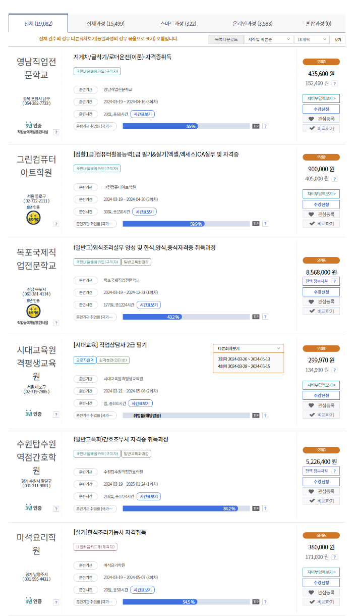 내일배움카드는 포토샵부터 홈페이지 제작, 메타버스, 디자인, 법무, 전산, 세무회계, 간호, 기계, 냉동공조, 전기 등 다양한 국비 지원 훈련 과정을 수강할 수 있습니다. 다만 HRD-Net (직업훈련포털)에 과정이 등록되어 있는 학원에서만 지원받을 수 있으니 꼭 먼저 확인해주세요.
