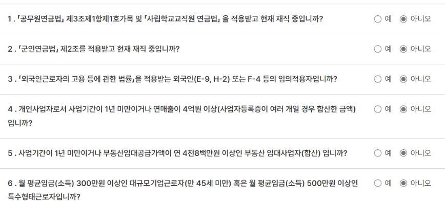 3) 이후 가입 요건 여부를 확인하세요. 꼼꼼히 읽어보시고 해당 사항이 없는지 확인하시되 아마 대부분 '아니오'를 선택하시게 될 겁니다. '예'를 누르는 순간 발급 제외 대상이 될 가능성이 높으니까요.