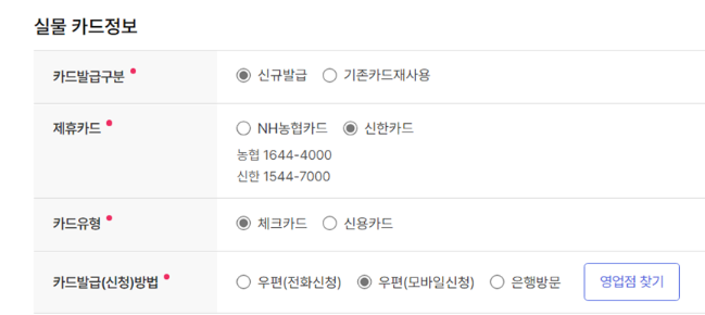 4) 발급받을 카드를 선택합니다. 카드는 신한카드와 NH농협카드 둘 중 하나 선택해서 발급받으시면 되는데요. 기존에 카드가 있는 분은 굳이 신규로 발급받지 않고 그대로 사용하셔도 됩니다.