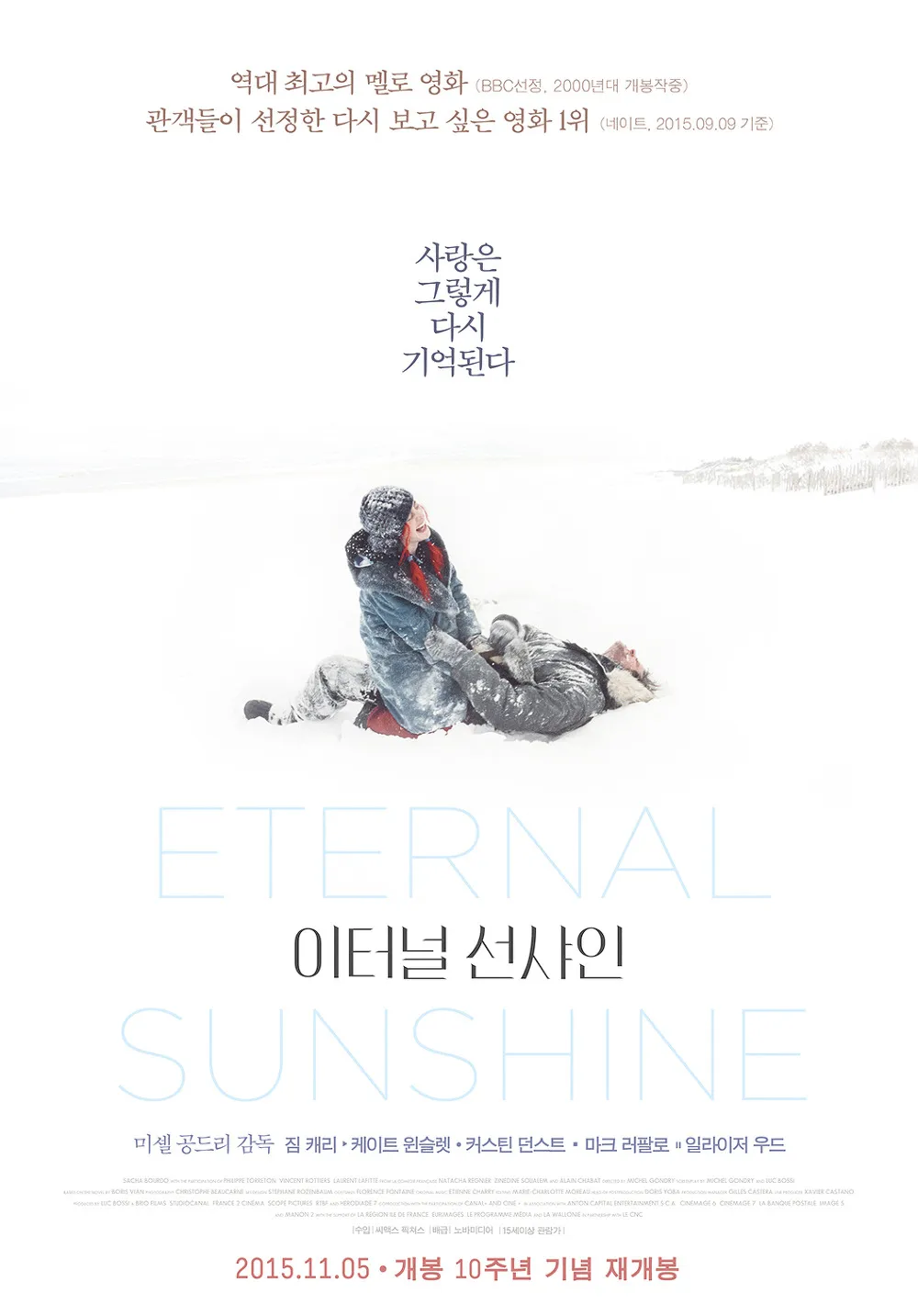 2005년 국내 첫 개봉 이후 10년 만에 재개봉, 한 번 더 신드롬을 일으킨 영화가 있다. 바로 <이터널 선샤인>이다. 헤어진 연인이 서로에 대한 기억을 삭제하면서 진짜 사랑을 깨닫게 된다는 이야기로 수많은 연인들의 눈물샘을 자극했던 영화다. "속는 셈 치고 다시 사랑을 믿어볼까 했던 영화"라는 한 줄 리뷰가 SNS에서 화제가 될 정도. 찰리 카우프만과 미셸 공드리가 각각 각본과 연출을 맡았다. 짐 캐리, 케이트 윈슬렛이 사랑에 빠진 남녀 주인공을 연기했는데 특히 이 영화에서는 짐 캐리의 새로운 모습을 볼 수 있다. 다른 출연작에서 대부분 코믹한 이미지로 나왔는데 이번 영화에서는 사랑에 상처 입은 남자를 진지하면서도 탁월하게 묘사했다. 처음 그가 남자주인공이라고 했을 때 어울리지 않는 조합이라고 생각한 것은 완전히 기우였다. 영화의 제목은 알렉산더 포프의 시 구절 'Eternal Sunshine of the Spotless Mind(티 없는 마음의 영원한 햇빛)'에서 따왔다. 해당 시는 중세의 대표적인 플라토닉 커플인 아벨라르와 엘로이즈의 편지에서 영감을 받았다고 하는데, 둘은 평생을 이렇게 편지만 주고받으며 사랑을 나누었다고 한다. 카우프만은 기억을 잃은 주인공들의 행동을 통해 그 순수한 사랑을 보여주고 싶었다고 한다. 로튼토마토에서 신선도 93%를 받을 정도로 독창적인 로맨 스을 인정받았다. 덕분에 제77회 아카데미 시상식 각본상을 포함해 수많은 영화제에서 상을 휩쓸었다.