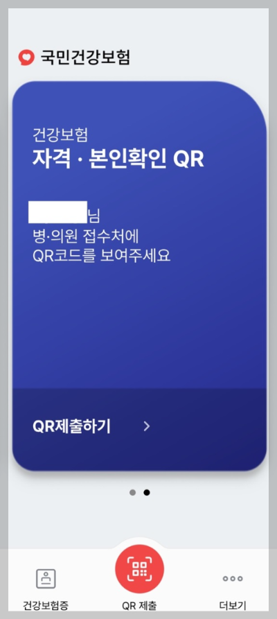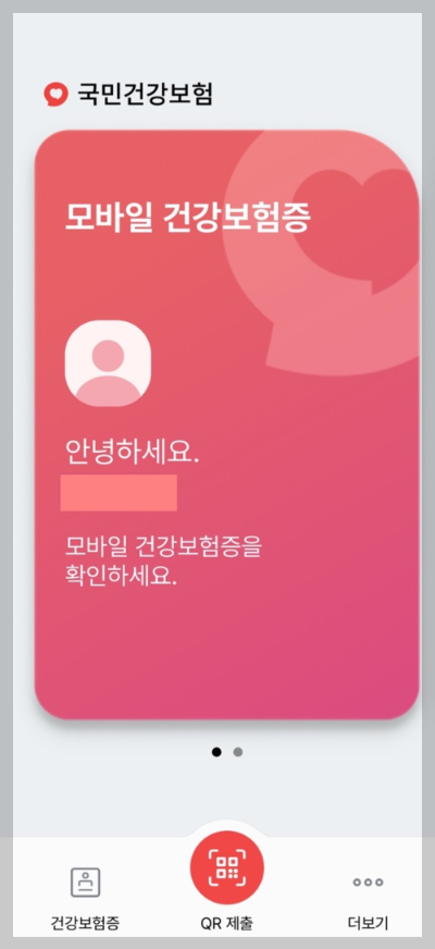 5) 본인 인증까지 끝났다면 99% 완료입니다. 본인 확인은 2가지 방법으로 가능한데요. 아래 화면에서 보이듯 왼쪽 빨간 배경의 모바일 건강보험증과 오른쪽 파란 배경의 QR인증입니다. 다만 현재 QR은 일부 병원에서만 사용 가능하다고 하니 병원에 가시면 그냥 왼쪽 모바일 모바일 건강보험증 보여주시면 됩니다.