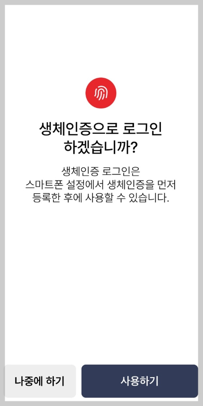 4) 다음은 로그인 비밀번호를 설정하시면 됩니다. 나중에라도 기억하기 쉬운 번호로 설정하세요. 따로 휴대폰 메모장에 적어두셔 되고요. 혹시 생체인증 기능이 들어간 핸드폰이라면 생체인증으로도 로그인 가능하니, 미리 설정해두시는 걸 추천드려요.