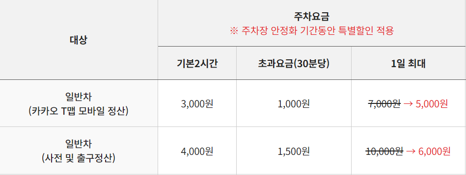주차요금은 일반차량의 경우 기본 2시간 4,000원에 30분당 1,500원씩 추가됩니다.