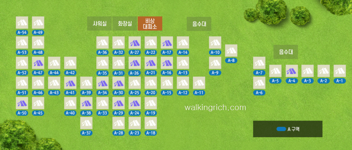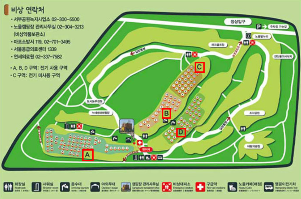 캠핑장 예약 시 가장 중요한 건 바로 위치 선정인데요. 아래 명당 위치는 제 주관적 견해에 의한 것이니 예약 시 참고만 부탁드립니다. 노을 캠핑장은 전체 A-D까지 총 4구역으로 되어 있고요. 그중에서 매점과 화장실, 맹꽁이차 탑승하는 곳 등 편의시설과 가장 가까운 구역은 A와 B구역입니다. 그중에서도 명당 위치를 성향별로 나눠본다면 아래와 같습니다.