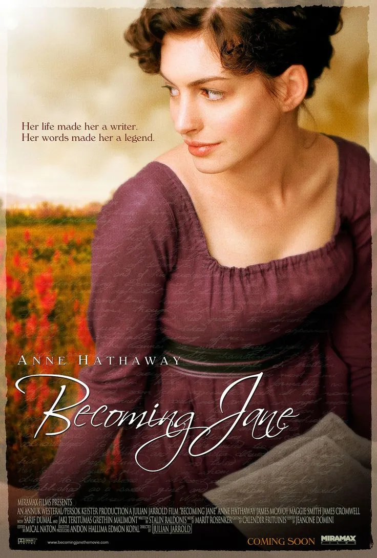 <센스 앤 센서빌리티><오만과 편견><엠마><클루리스><맨스필드 파크>. 이 영화들의 공통점은 무엇일까. 바로 제인 오스틴의 소설을 원작으로 만들어진 영화라는 것이다. 그녀의 소설들은 역사상 가장 많이 영상화되었다 해도 과언이 아니다. 그녀가 남긴 장편소설 6편 모두 영화와 드라마로 여러 차례 만들어졌기 때문이다. 1700년대 사람인 제인 오스틴의 작품이 지금까지도 계속 영상화되고 사랑받는 이유는 의외로 단순하다. 시대가 흘러도 변치 않는 보편적 감성, 여성들의 사랑과 연애라는 주제를 탁월하게 그려냈기 때문이다. 그녀의 소설에 등장하는 주인공들은 모두 사랑 앞에 당당하고 밝고 적극적이다. 세상의 시선에 결코 주저앉지 않고 자신만의 삶을 살아간다. 그녀가 들려주는 연애담이 오늘의 우리가 봐도 전혀 낯설지 않은 건 그 때문이다. 그렇다면 제인 오스틴 본인은 실제 어떤 삶을 살았을까. 그녀의 소설 속 주인공들처럼 아름답고 예쁜 사랑을 했을까. 그에 대한 상상력에서 출발한 것이 바로 영화 <비커밍 제인>이다. 제인 오스틴의 삶을 주제로 앤 해서웨이와 제임스 맥어보이가 주연을 맡은 2007년 작품이다. 앤 해서웨이가 주인공 제인 오스틴을, 제임스 맥어보이가 그녀와 사랑에 빠지는 변호사 톰 르프로이를 연기했다. 개인적으로 두 사람의 미모는 이 영화를 촬영할 때 가장 절정에 오른 것 같다. 연기도 훌륭하지만 두 사람의 아름다운 모습을 보는 것도 이 영화를 보는 큰 재미 중 하나이다.