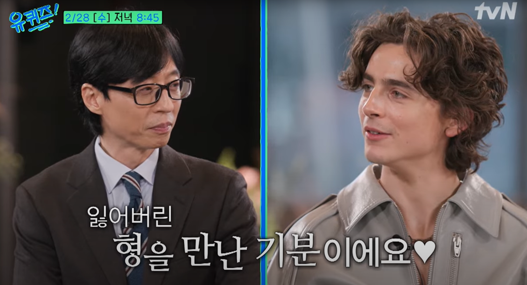 그런데 이 엄청난 친화력 뭐죠? 처음 만나는 유재석에게 잃어버린 형 같다고 말하는 티모시 샬라메.