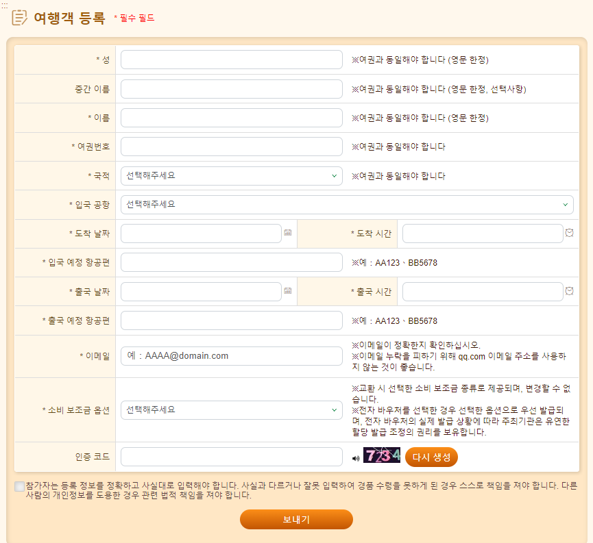 ① 당첨되면 여권 및 관련 증명 서류(입국 도장, 탑승권 및 전자 왕복 항공권)를 수령처로 가지고 가서, 서명 후 여행지원금을 수령하면 됩니다. * 관련 서류를 수령처에 제공하지 않은 경우, 소비 지원금을 수령할 수 없습니다.