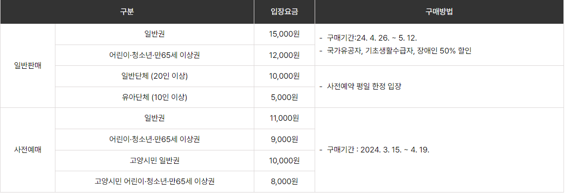 입장권 할인을 받기 위해 2024. 3. 15. ~ 4. 19. 사전 예매 기간 동안 입장권을 구매하시면 됩니다.