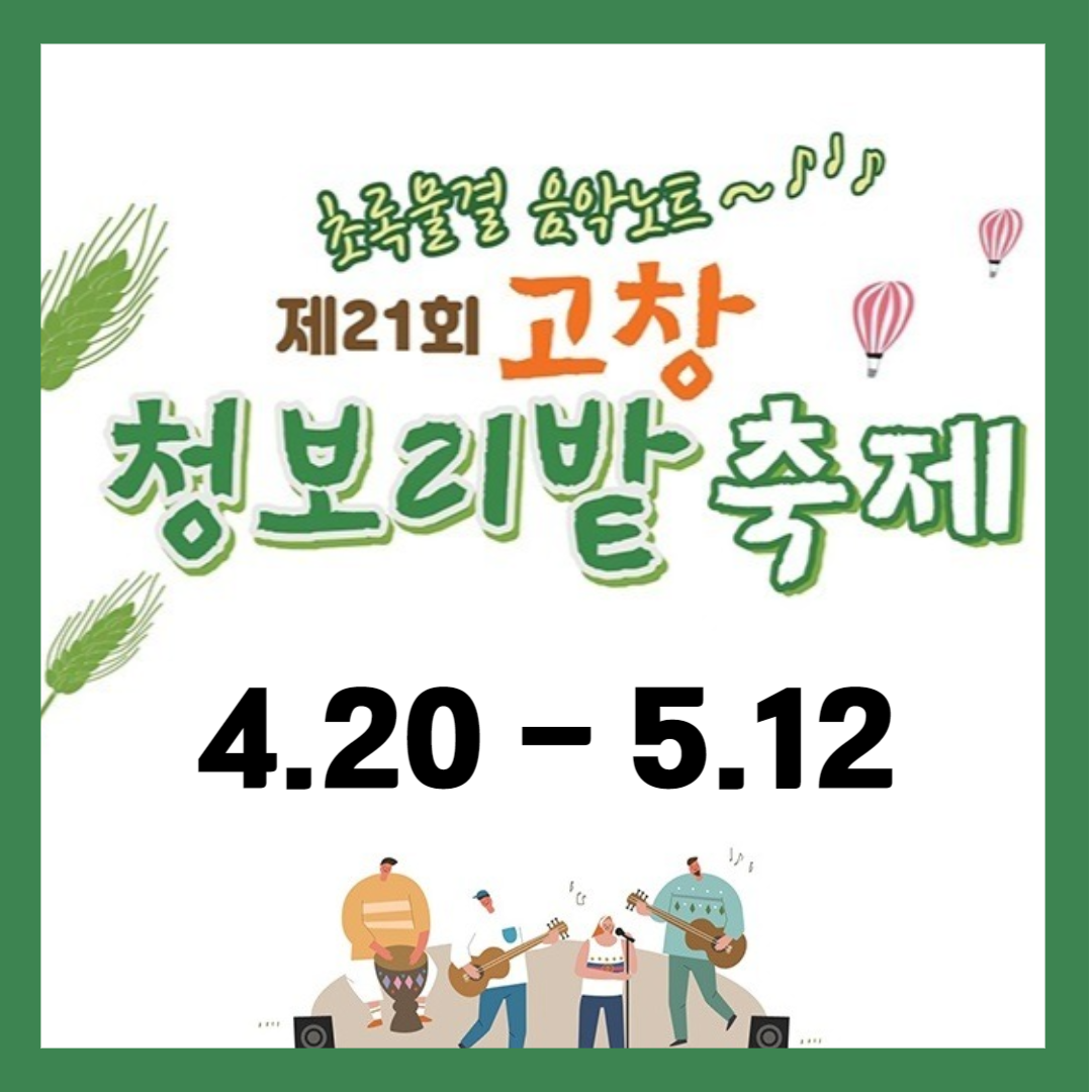 지금부터 고창 청보리밭 축제 기간과 입장료, 가는 방법, 축제 프로그램, 맛집 등에 대해서 알려드릴테니 꼭 잊지 못할 추억 만들어보시길 바랍니다. 특히 이번 축제기간엔 어른, 아이 모두 함께 즐길 수 있는 다양한 행사가 있어서 더욱 추천드려요!