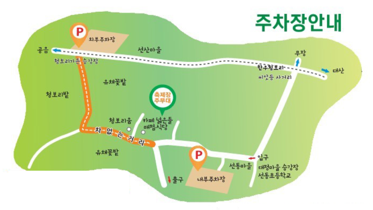청보리밭 축제장에 차를 갖고 가시는 분은 아래 학원농장에 있는 3곳의 주차장을 이용하시면 되는데요. 장소가 협소하다 보니 일찍 출발하시는걸 추천드립니다.
