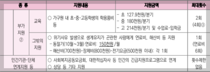 이때 위기사유는 정말 다양한데요. 대표적인 예가 주소득자의 실직, 사망, 가출, 행방불명 등으로 소득이 없어진 경우이고 중한 질병이나 부상을 당한 경우, 이혼한 경우 등 범위가 넓기 때문에 나머지 사유에 대해서도 아래에서 확인하신 후 해당되시는 분들은 꼭 신청해서 받아보시길 바랍니다. 결코 적지 않은 금액이니까요.