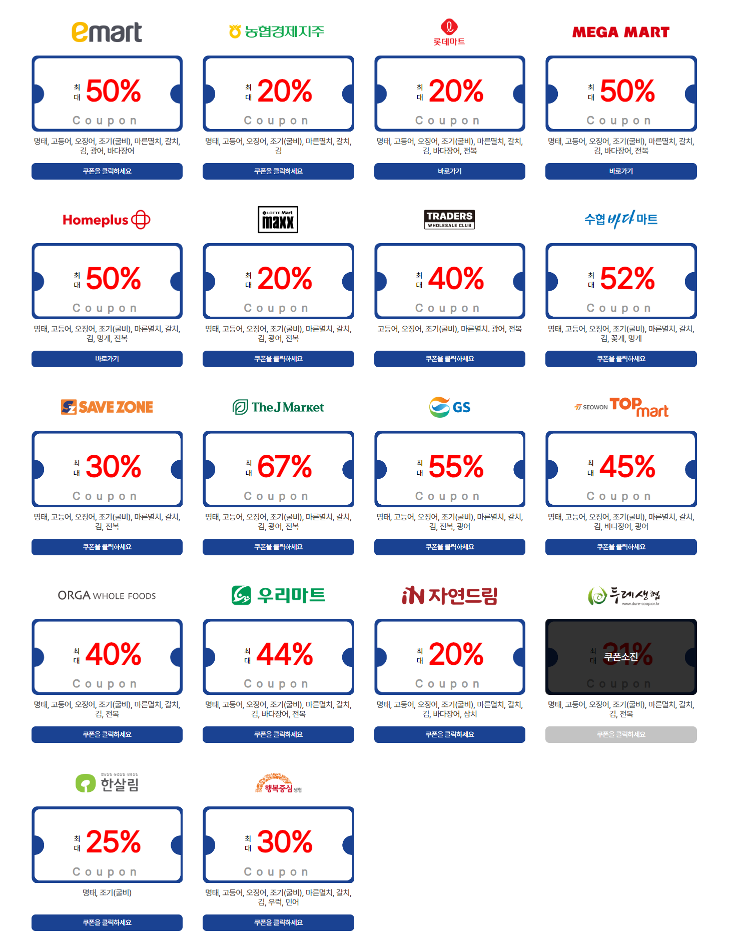 이마트, 홈플러스, 세이브존, 롯데마트, 한살림 등 총 오프라인 매장에서 최대 57%까지 할인받을 수 있는 수산대전 쿠폰입니다.