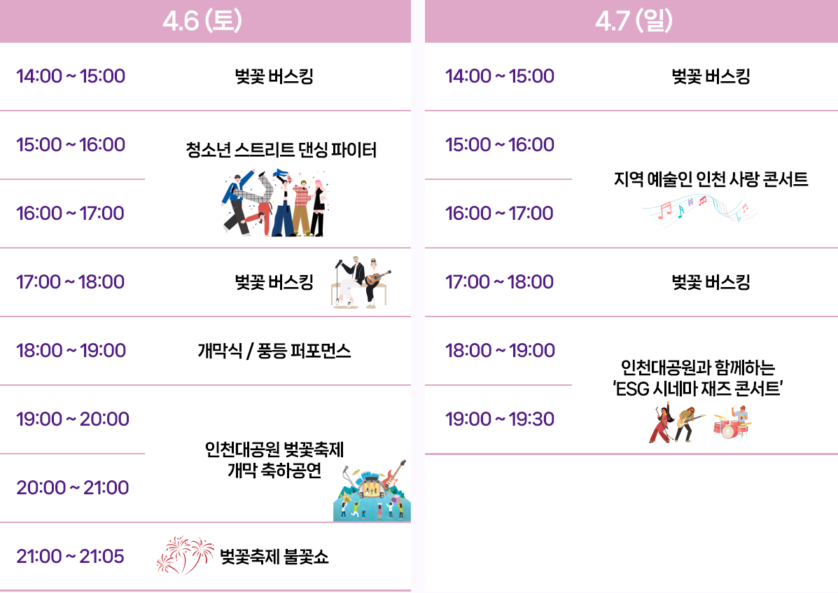 이틀에 걸쳐 열리는 인천 벚꽃축제는 다양한 프로그램이 함께 진행되는 만큼 미리 일정 체크해서 가시면 중간에 시간 낭비 없이 공연 감상과 체험이 가능하실 거예요! 아래 일정표 확인해주세요.
