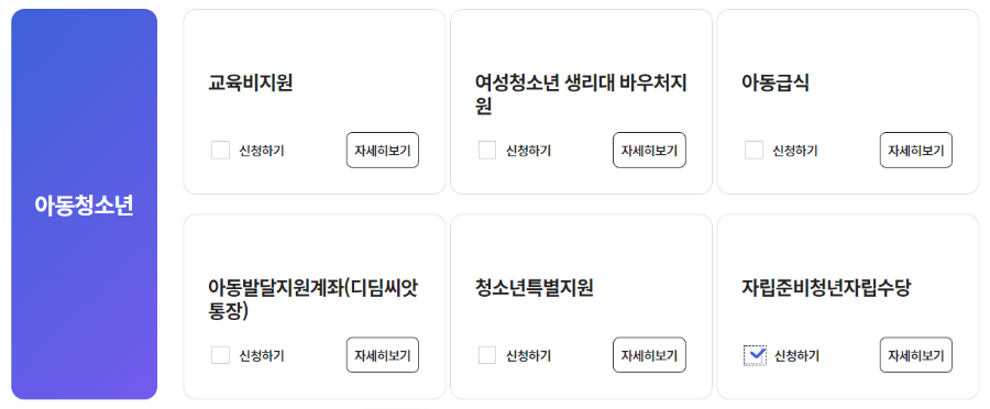 ② 자립준비청년 자립수당 항목에서 [신청하기] 체크 후, [자세히보기] 버튼을 클릭