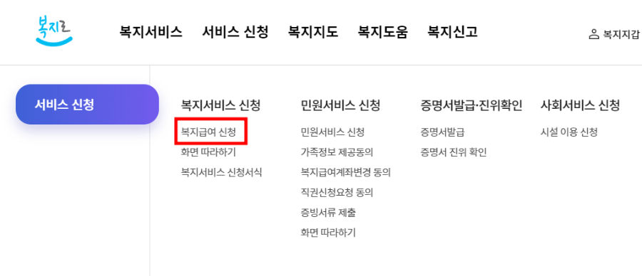 ① 복지로 홈페이지 로그인 → 상단 메뉴 [서비스 신청] → [복지서비스] - [복지급여] 신청 클릭
