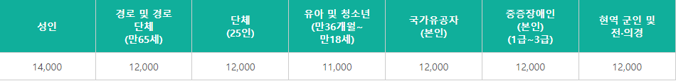 ①경로 및 단체 / 국가유공자 / 중증장애인 / 현역 군인 및 전,의경 : 12,000원