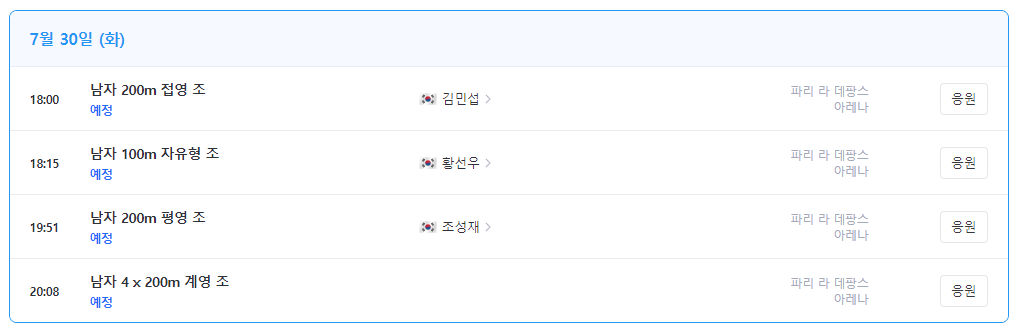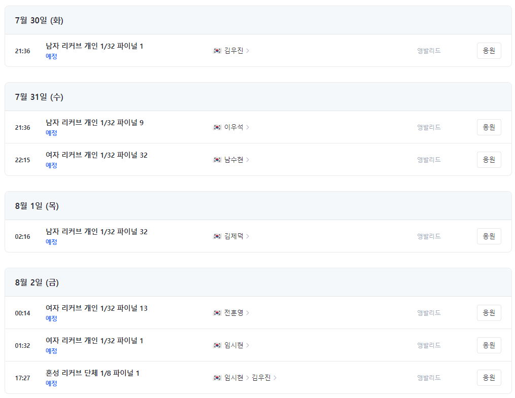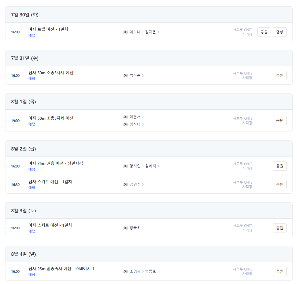 이외에도 배드민턴, 복싱, 다이빙, 역도, 유도 등 더 많은 종목별 경기 일정은 아래에서 바로 확인하실 수 있어요!